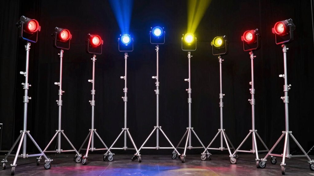 Ever wondered how easy it is to transport and store heavy-duty stage lighting stands? Lightweight materials like aluminum or steel make a big difference, so these stands are easier to carry around. Foldable or collapsible designs allow for compact storage, saving space when not in use. Many kits include carry bags or storage cases, which keep everything organized and quick to set up at different venues. Adjustable height features and removable parts help you pack the stands efficiently, making transportation smoother. Plus, sturdy, compact stands with locking mechanisms ensure safe storage, preventing accidental damage or collapse. Overall, considering portability and storage options can make your setup and takedown much more manageable, saving time and effort during performances or events.