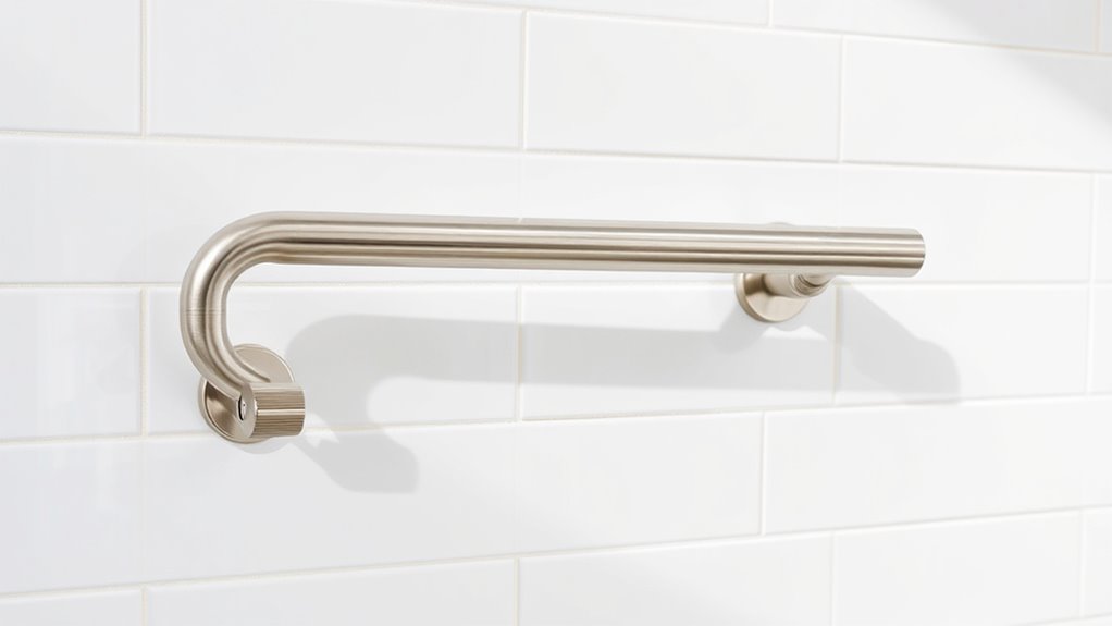 Cleaning stainless-steel grab bars is a breeze—just wipe them down with a soft cloth and a mild soap solution. I avoid harsh chemicals that could tarnish their shine. To keep them looking new, I polish with a stainless-steel cleaner occasionally. Remember, a little regular maintenance keeps your grab bars shiny, rust-free, and ready to save the day—because who doesn’t want their safety gear to sparkle?