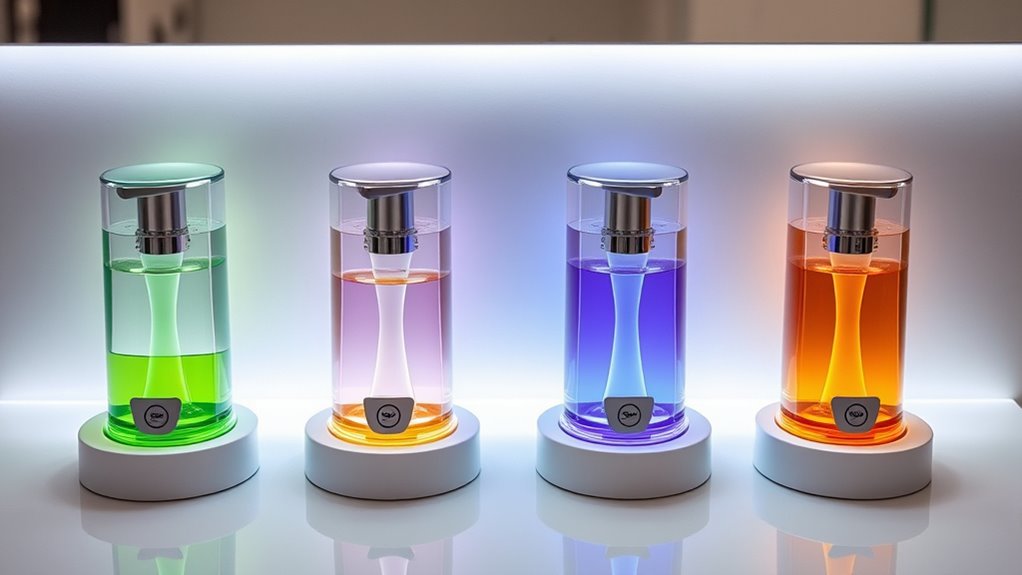 Have you ever thought about how the scent of your soap affects your overall handwashing experience? Fragrance options in touchless refills vary from scent-free to lively aromas like citrus, lavender, or pomegranate. Choosing a scent can make your handwashing more enjoyable and even mask soap odors, leaving a fresh feeling. If you have sensitive skin or prefer a neutral experience, fragrance-free options are ideal—they reduce the risk of allergic reactions and are often hypoallergenic. Some scented refills include essential oils or natural extracts, offering aromatherapy benefits that can boost your mood. The scent you pick influences your perception of cleanliness and satisfaction. Whether you prefer a subtle aroma or a bold scent, selecting the right fragrance enhances both hygiene and overall experience.