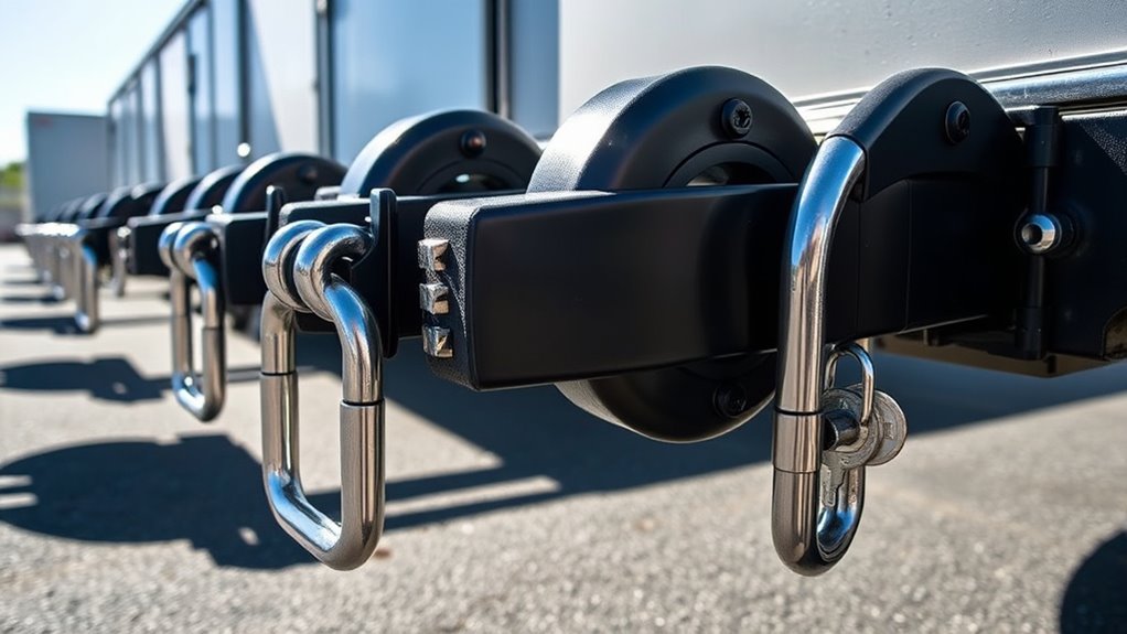 Selecting a trailer tongue lock with durable materials is vital for guaranteeing long-lasting security, especially when protecting restroom rigs. High-quality locks are made from hardened steel, alloy steel, or zinc alloy, which resist cutting, prying, and corrosion. The strength of these materials directly impacts the lock’s ability to withstand physical attacks from bolt cutters, hammers, or grinders, greatly reducing theft risks. Weather-resistant finishes like powder coating or zinc plating help maintain the lock’s integrity over time by preventing rust and corrosion. Thicker, reinforced materials, including heavy-duty pins and steel bodies, further enhance security and durability. Regular maintenance and inspection of the lock’s material condition are indispensable to prolong its lifespan and ensure continuous protection against environmental damage and tampering.