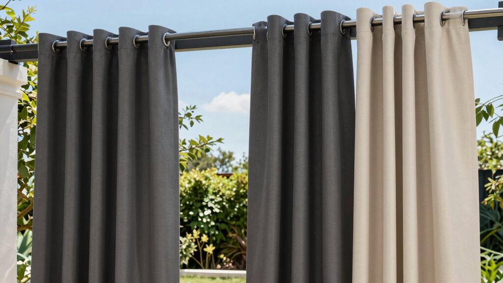 Fabric weight and thickness help outdoor curtains withstand strong winds, but protecting them from sun damage is equally important for durability. UV-resistant outdoor curtain panels are crafted with fabrics treated with special coatings that prevent UV rays from breaking down the material over time. These sun-resistant curtains can block up to 95% of harmful ultraviolet radiation, shielding your outdoor furniture from fading and damage. Materials like polyester or vinyl are commonly used for their weatherproof qualities and high UV resistance, helping the fabric retain its color, strength, and flexibility even after prolonged sun exposure. Proper UV protection not only prolongs the lifespan of your curtains but also reduces the need for frequent replacements, ensuring your outdoor space stays vibrant and protected year after year.